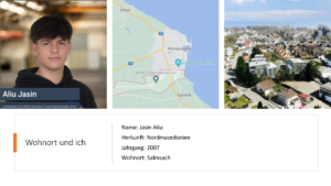 Mein Name ist Jasin Aliu und ich bin 15 Jahre alt. Ich wohne in Salmsach und arbeite bei inno Plan Bauingenieure in Arbon. In meiner Freizeit spiele ich gerne Videospiele, spiele Fussball und unternehme etwas mit meinen Freunden.