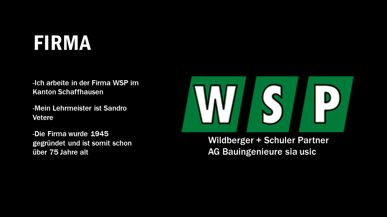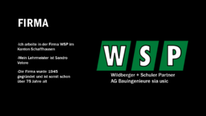 Ich bin Silvan Lutz, 15 Jahre alt, Zeichner Fachrichtung Ingenieurbau bei der Firma WSP im Kanton Schaffhausen. Mein Lehrmeister ist Sandro Vetere. Die Firma wurde 1945 gegründet und hat über 75 Jahre Erfahrung. Bei WSP durfte ich einen Schalungs- und Bewehrungsplan für eine Bodenplatte erstellen, was eine spannende Erfahrung war. In meiner Freizeit spiele ich Fußball beim FC Schleitheim, schaue FC Schaffhausen, fahre im Winter Ski und bin in der Jungschi aktiv.